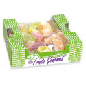 La golosina más natural del mercado. Sin gluten y sin colorantes artificiales. Hecha con pectina de la fruta. 16 cajitas. Cada cajita lleva 500g de gominolas. 7 sabores: Naranja, Limón, Fresa, Mandarina, Pera verde, Pera amarilla y Mora.
